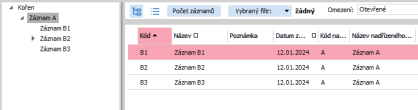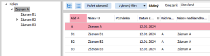 - V zozname sú vždy zobrazené len záznamy, ktoré sú podriadené aktuálnemu záznamu v strome (aktuálnej vetve stromu). Ak daný záznam stromu (aktuálna vetva) nemá podriadený záznam, zoznam je prázdny. Strom tu teda slúži ako FILTER. Po vykreslení zoznamu sa ukazovateľ vpravo v zozname postaví na prvý záznam v poradí podľa zvoleného triedenia!Obrázok 1: Aktuálny záznam v strome je "Záznam A" a vpravo v zozname sú jemu podriadené B1, B2, B3. Ukazovateľ v zozname ukazuje na prvý v poradí podľa triedenia, tzn. na záznam B1. ABRA vzhľad modrý.