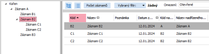 a nech je v strome aktívna vetva B2 a zoznam vpravo zobrazuje záznamy C1, C2 a B2:Ak je fókus v strome vľavo (na vetve B2), tak funkcia Nový pridá B4.