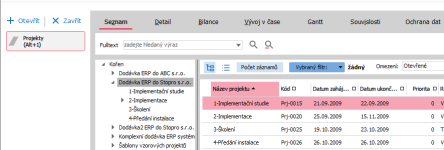 Príklad zobrazenej hierarchickej štruktúry projektov. ABRA vzhľad.