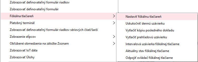 Na nastavenie fiškálnej tlačiarne pripojenej k danému počítaču a tiež na tlač dennej a prehľadovej uzávierky. K dispozícii v agendách pokladničných dokladov modulu Pokladňa, tzn. Pokladničný príjem, Pokladničný výdaj, Vrátenie pokladničných príjmov, Vrátenie pokladničných výdajov. Funkcia v menu Fiškálna tlačiareň Viac viď Fiškalizácia v module Pokladňa, evidencia tržieb, e-Kasa. |