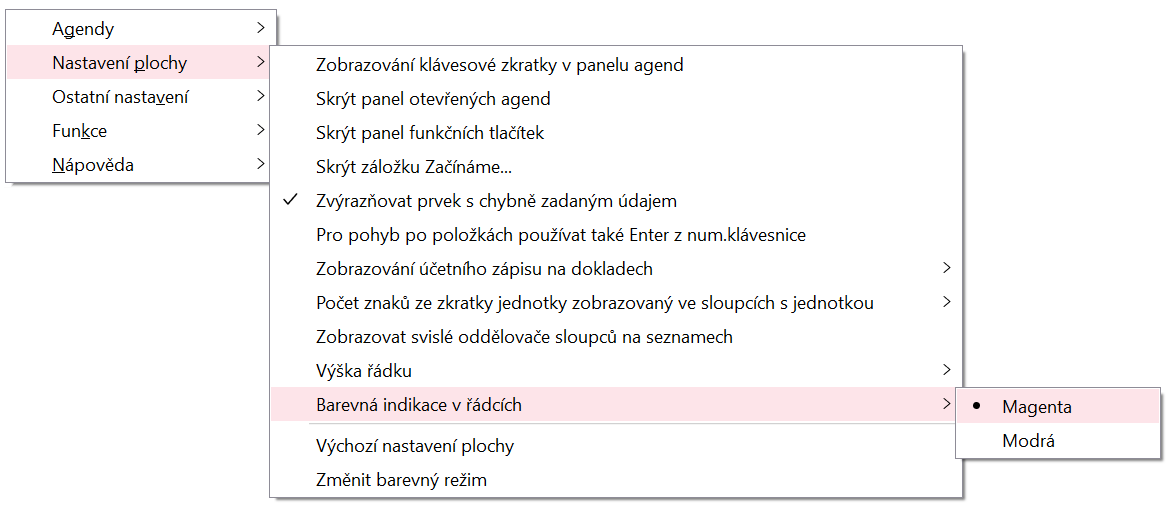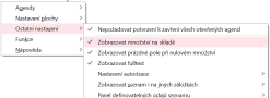 , který uvozuje, že volba menu se dále větví. Pohybovat po jednotlivých volbách a úrovních menu můžete myší nebo z klávesnice, viz dále. Menu se ihned interaktivně rozbaluje/sbaluje doprava příp. doleva podle místa na obrazovce a podle úrovně menu. Pomocou možností vo voľbe Agendy si môžete otvárať ďalšie agendy, zatvárať agendy alebo sa prepínať medzi súčasne otvorenými. Možnosti vo voľbe Nastavenie plochy a Ostatné nastavenia slúžia na prispôsobenie vzhľadu programu podľa požiadaviek a nastavenia zobrazenia niektorých prvkov. Vo voľbe Funkcie potom nájdete všetky funkcie dostupné v danej agende a jej aktuálne zobrazenej záložke. Viď tiež Funkcie, klávesové skratky. Jedná se o jednu z možností, jak spouštět funkce.