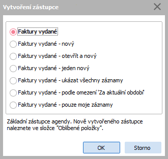 Funkcia na vytvorenie zástupcu na rýchle spustenie vybranej agendy v požadovanom tvare. Vytvorený zástupca je k dispozícii v zložke Obľúbené položky v okne na spúšťanie agend. Jednotlivé agendy podporujú vytvorenie zástupcu niekoľkých typov pre seba samotné. Po vyvolaní funkcie sa typicky ponúkne niekoľko možností vytvorenia zástupcu. Aké možnosti sú k dispozícii, závisí od toho, o akú agendu ide (dokladovú alebo číselníkovú): Príklad možností tvorby zástupcov agendy Faktúr vydaných Príklady možností zástupcov: Základný - základný zástupca agendy. Zástupca na rýchle obstaranie nových záznamov. Pri otvorení agendy pomocou tohto zástupcu sa agenda vyvolá v špeciálnom režime, keď sa agenda zobrazí bez hlavných záložiek a umožňuje len pridávanie záznamov. Prípadné definované východiskové obmedzenie sa ignoruje. Výsledkom je agenda otvorená akoby priamo v záložke Detail s tým, že používateľ žiadne iné záložky na rovnakej úrovni nevidí, tzn. nie je obťažovaný záložkami Obmedzenie, Zoznam atď. a s tým, že je rovno v editácii nového záznamu a môže zadávať. Po uložení nového záznamu sa zobrazí otázka, či sa má pokračovať ďalším záznamom. Ak áno, rozedituje sa ihneď ďalší nový záznam, ak nie, takto otvorená agenda sa zavrie. Tento zástupca je k dispozícii len v tých agendách, ktoré podporujú ručné pridávanie nových záznamov. V agendách, ktoré funkciu F2=Nový nepodporujú, pretože záznamy v nich sa obstarávajú iným spôsobom (napr. Účtovné žiadosti a pod.), nemá tento zástupca význam. Ide o jednu z možností, ako v systéme rýchlo obstarať nový záznam, viď aj Často kladené otázky - otázka Urýchlenie zadania dokladu ihneď po otvorení agendy. Zástupca na rýchle obstaranie nových záznamov. Variant zástupcu typu "Nový", ale s tým rozdielom, že pri otvorení agendy pomocou tohto zástupcu sa agenda otvorí v bežnom režime, tzn. štandardným spôsobom vrátane všetkých záložiek. Urýchlenie spočíva v tom, že sa agenda otvorí, vynechá sa prípadné nastavené východiskové obmedzenie a rovno sa vyvolá funkcia F2 = Nový zo záložky Zoznam. Výsledkom bude otvorená agenda, v ktorej záložke Zoznam nebude žiadny záznam (nebol vykonaný žiadny dopyt funkciou Získať záznamy) a ktorá bude priamo v stave editácie nového záznamu. Po uložení nového záznamu sa nezobrazuje žiadna otázka, agenda sa nijako automaticky nezaviera a používateľ v nej môže ďalej bežným spôsobom pracovať. Tento zástupca je k dispozícii len v tých agendách, ktoré podporujú ručné pridávanie nových záznamov. V agendách, ktoré funkciu F2=Nový nepodporujú, pretože záznamy v nich sa obstarávajú iným spôsobom (napr. Účtovné žiadosti a pod.), nemá tento zástupca význam. Téhož byste dosáhli otevřením agendy přes základního zástupce s tím, že v agendě nemáte nastaveno výchozí omezení anebo s tím, že před otevřením agendy zapnete klávesu <Scroll Lock> pro potlačení provedení výchozího omezení. Po otvorení agendy v záložke Obmedzenie nebudete zadávať žiadne obmedzenie a nebudete spúšťať funkciu Získať záznamy, vstúpite na záložku Zoznam a následne v záložke Zoznam vyvoláte funkciu F2 = Nový. Ide o jednu z možností, ako v systéme rýchlo obstarať nový záznam, viď aj Často kladené otázky - otázka Urýchlenie zadania dokladu ihneď po otvorení agendy. Zástupca na rýchle obstaranie jedného nového záznamu. Variant zástupcu typu "Nový", ale s tým rozdielom, že po uložení záznamu sa agenda bez otázky ihneď rovno zavrie. Tento spôsob vyvolania agendy sa využíva napr. vo funkcii Nová firma v agende Call Centrum. Má význam len pre dokladové agendy. Pri otvorení agendy pomocou tohto zástupcu sa agenda otvorí, vynechá sa prípadné nastavené východiskové obmedzenie a priamo sa vyvolá funkcia Získať záznamy. Prebehne teda dopyt do databázy bez obmedzenia. Výsledkom bude otvorená agenda, ktorá bude mať v záložke Zoznam všetky záznamy danej agendy bez obmedzenia (resp. obmedzené maximálne prístupovými právami používateľa, viď aj Obmedzenie verzus Prístupové práva, výnimky a upozornenia v súvislosti s obmedzovaním za chránené objekty). Tento zástupca je k dispozícii len v dokladových agendách so záložkou Obmedzenie, v iných nemá význam. Téhož byste dosáhli otevřením agendy přes základního zástupce s tím, že v agendě nemáte nastaveno výchozí omezení anebo s tím, že před otevřením agendy zapnete klávesu <Scroll Lock> pro potlačení provedení výchozího omezení. Po otvorení agendy vstúpite na záložku Obmedzenie, žiadne obmedzenie tu nezadáte a následne v záložke Obmedzenie vyvoláte funkciu Získať záznamy. Má význam jednak pre dokladové agendy, tak pre číselníkové agendy.