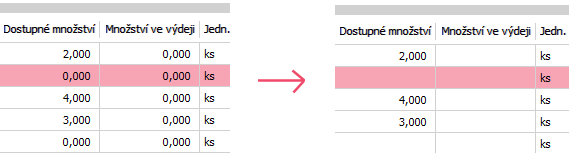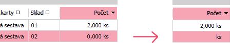 Zatržení volby způsobí, že se ve vybraných polích místo nulového množství zobrazí prázdná pole. Ovlivňuje způsob zobrazení obsahu stejné množiny polí, jako firemní parametr Počet desetinných míst pro zobrazení skladové dispozice. Je k dispozici v agendách: Pokud některé pole ve výchozím zobrazení obsahuje číselný údaj doplněný o hlavní jednotku skladové karty (například pole Počet v seznamu skladových karet), po zatržení této volby se bude v buňkách s nulovou hodnotou zobrazovat pouze jednotka skladové karty. Dopad zatržení této volby na zobrazení pole Počet. Dopad zatržení této volby na zobrazení obdobných polí, které jsou k dispozici, pokud je zapnuto Skladové doklady (používať procesné riadenie).