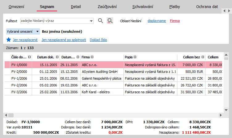 V hornej časti záložky Detail môže byť variantne zobrazený niektorý z Panelov definovateľných údajov detailu pre túto agendu. Zobrazenie panela definovateľných údajov detailu závisí na aktuálnom nastavení tejto voľby pre danú agendu a prihláseného používateľa. Panel definovateľných údajov sa danému používateľovi v danej agende zobrazuje, ak je aktuálne začiarknutá niektorá z definícií panelov def. údajov detailu (teda je vybraná na zobrazovanie). Príklad záložky Detail v agende faktúr vydaných s aktuálne zobrazeným panelom def. údajov detailu (hore) s nadefinovanými základnými informáciami o aktuálnom doklade vr. informácie o kredite pre danú firmu. ABRA vzhľad. |