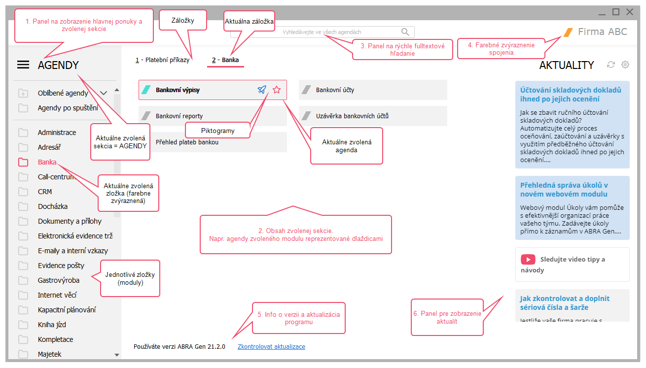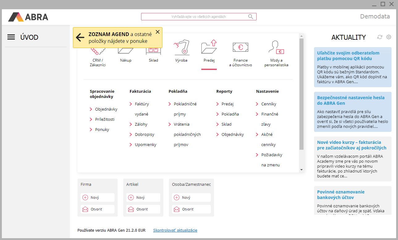 Jedná se o úvodní okno systému ABRA Gen pro spouštění agend příp. jiných úloh/aplikací. Pre rýchle dohľadanie agendy je k dispozícii rýchle fulltextové hľadanie s viacerými režimami použitia (je možné používateľsky nastaviť).