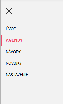 - Agendy - pak se zobrazí sekce AGENDY a aktivní bude dlaždice, která byla naposledy aktivní (při předchozím zavřením okna). Pokud se zatím žádná dlaždice pro daného uživatele z předchozího zavření okna nepamatuje, otevře se okno tam, kde uživatel byl naposledy. Pokud takový uživatel klikne na sekci AGENDY, nastaví se složka Obľúbené agendy. Pokud má přihlášený uživatel i nějaké agendy ve složce Agendy po spustení, pak se po spuštění spustí tyto agendy. Po zavolání funkce Otvoriť ďalšiu agendu se zase zobrazí sekce AGENDY s naposledy aktivní dlaždicí.