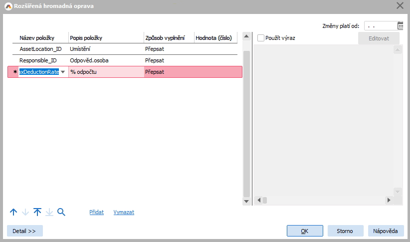 Novú požadovanú hodnotu môžete definovať aj výrazom. Je-li zatržena položka Použít výraz v pravé horní části dialogového okna, zpřístupní se pole pro zadání výrazu a současně se znepřístupní pole Nová hodnota v levé části okna.
