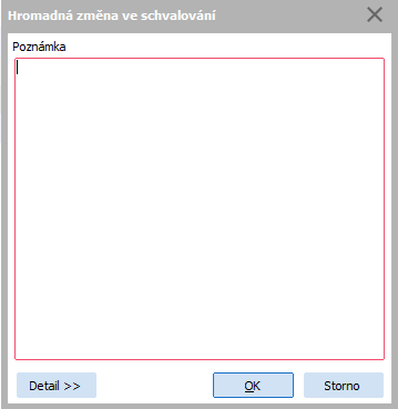 Príklad dialógového okna na zadanie poznámky pri vykonaní hromadného schválenia viacerých označených záznamov naraz v agende Schvaľovania dokladov