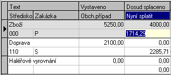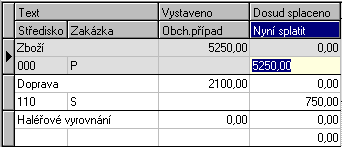 | Teraz splatiť | Suma, v akej výške sa má daný riadok danou platbou splatiť. Položka môže byť zadaná ľubovoľne ručne alebo sa môže predvyplniť podľa toho, aký ste zvolili spôsob rozdelenia platby. Súčet súm v položkách Teraz splatiť za všetky riadky sa musí samozrejme rovnať položke Suma platby, viď vyššie, inak program nepovolí doklad uložiť. |