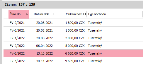 Triedenie podľa stĺpca, pričom doklady sú zoradené podľa poradových čísel v rámci obdobia, tzn. 1/2021, 2/2021 a až potom 1/2022