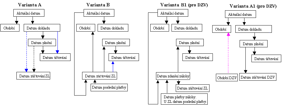 Väčšinu z vyššie uvedených prípadov vystihuje nasledujúci schematický obrázok. Variant A znamená vystavenie nového samostatného dokladu s prípadným následným pripojením ZL, tzn. následným zúčtovaním ZL (čiarkovane), variant B vystavenie nového dokladu podľa ZL. Modrou sú vyznačené prípady dokladov bez DPH: