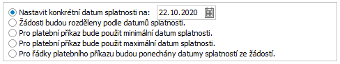 poslední možností (od verze 20.3) je převzít na jednotlivé řádky platebního příkazu datumy splatnosti ze žádostí, vytvořený platební příkaz (a vyexportovaný soubor) pak může obsahovat několik různých datumů splatnosti