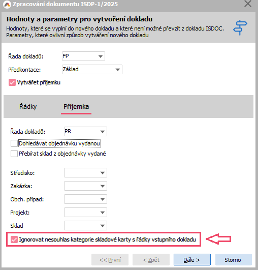 V sprievodcovi pre import ISDOC faktúry prijatej je na záložke Príjemka začiarkávacie pole Ignorovať nesúhlas kategórie skladové karty s riadkami vstupného dokladu.