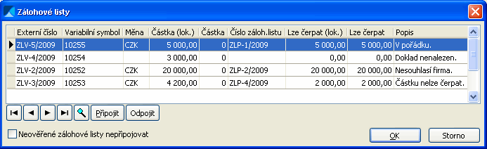 Ak sa nepodarí nájsť zálohové listy, ktoré majú požadovanú firmu a externé číslo, systém ponúkne možnosť vyhľadať a pripojiť ich ručne. Zobrazí sa dialógové okno so zoznamom zálohových listov, ktoré boli zúčtované u dodávateľa do importovanej ISDOC faktúry. Pre každý je uvedené očakávané externé číslo (rovná sa číslu dokladu zálohového listu u dodávateľa), var. symbol zálohového listu vystaveného u dodávateľa, mena a sumy v lokálnej a cudzej mene (ak ide o ZL tuzemský, je tu zobrazená suma v cudzej mene nulová). Ďalej je tu uvedené číslo pripojeného záloh.listu z nášho systému ABRA Gen (dohľadaného automaticky alebo ručne používateľom, viď ďalej) s údajom, koľko z nich je ešte možné čerpať v lokálnej a cudzej mene. V položke Popis je informácia o pripojenom ZLP.