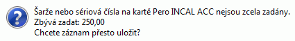 Zobrazuje celkové množství příslušné položky (hodnota Počet na subzáložce Obsah, v použité jednotce) a množství zadaných šarží nebo sériových čísel zadaných na této subzáložce. Pokud nejsou vyplněny šarže / sér. čísla pro celý počet, zobrazí se při ukládání dokladu varování (soft validační upozornění). Pro aktuální položku uvedenou na subzáložce Obsah nejsou zcela zadány šarže. V opačném případě (počet zadaných šarží nebo sériových čísel je vyšší než celkový počet na subzáložce Obsah) se rovněž zobrazí upozornění, ale v tomto případě není možné doklad uložit (hard validace). |