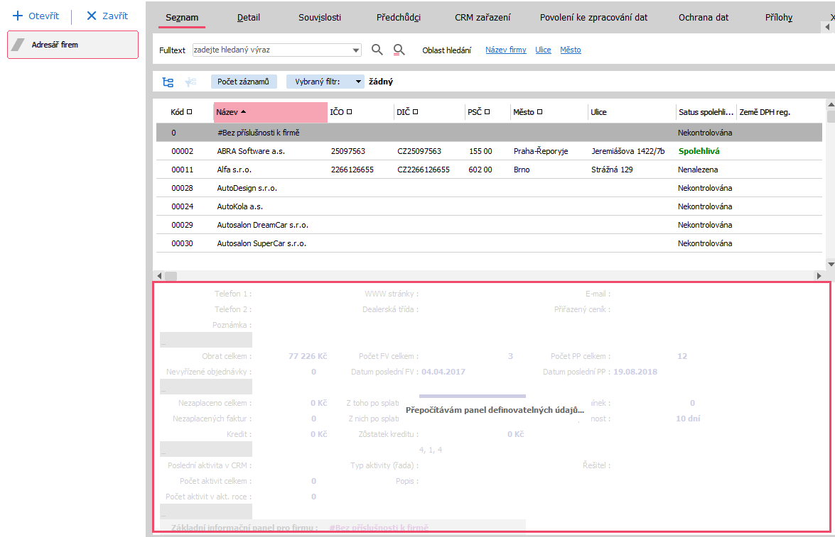 V praxi tedy může uživatel dál procházet seznam záznamů a údaje jsou průběžně dopočítávány a zobrazí se, až se uživatel zastaví na nějakém konkrétním záznamu. Při dopočítávání údajů je místo dat v panelu definovatelných údajů zobrazena informace, že probíhá výpočet.