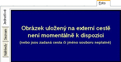 Slúži na detailné zobrazenie jednotlivých obrázkov. Ak záložka Foto obsahuje viac ako jeden obrázok, tak v tomto zobrazení sa jednotlivé obrázky zobrazujú každý zvlášť na svojej vlastnej samostatnej číslovanej subzáložke. Uši týchto subzáložiek sú v takom prípade v spodnej časti pod obrázkom (ak záložka Foto nezobrazuje ani jeden obrázok, nie sú číslované subzáložky k dispozícii, boli by zbytočné). Vytvárajú sa automaticky, keď je na záložku Foto pridaný prvý, druhý a ďalší obrázok. Číslo záložky zobrazované na jej uchu zodpovedá poradiu obrázka. Poradie obrázkov je možné meniť, viď ďalej tlačidlá na zmenu poradia. Pod obrázkom je možné zadať jeho popis, ako aj informácie o veľkosti obrázka.