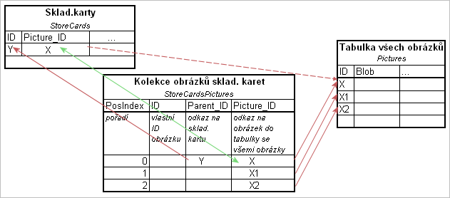 Schéma internej realizácie uloženia obrázkov. Položka Picture_ID hlavnej tabuľky (tu tabuľky skladových kariet) obsahuje rovnaké ID (v schéme uvedené ako hodnota "X") ako prvý obrázok, ktorý bol vložený do kolekcie obrázkov skladovej karty na záložke Foto. V schéme naznačené zelenou šípkou. Červené šípky zvýrazňujú odkazy na iné záznamy, tzn. z kolekcie obrázkov sa každý záznam odkazuje na sklad. kartu, ku ktorej patrí (v schéme uvedené ako hodnota "Y"), a ďalej sa odkazuje na ID obrázkov uložených v tabuľke všetkých obrázkov, kde je v položke "Blob" uložený samotný obsah každého obrázka. Vo verziách starších ako 10.02 sa položka Picture_ID hlavnej tabuľky odkazovala priamo na ID obrázka do tabuľky všetkých obrázkov (v schéme naznačené prerušovanou čiarou).