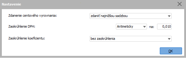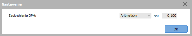 Pre doklad s DPH budete mať nastavené zaokrúhlenie sumy DPH na desaťcenty smerom nahor. Systém potom vypočítanú sumu DPH automaticky takto zaokrúhli. Ďalej, ak nechcete napr. v rámci vystavovaných faktúr operovať s desaťcentami, môžete si nastaviť zaokrúhlenie celkovej sumy napr. smerom nahor na eurá. Vzniknutý riadok zaokrúhlenia má potom interne priradený typ "zaokrúhlenie", pre ktorý je možné nadefinovať aj nasledujúce účtovné predkontácie.