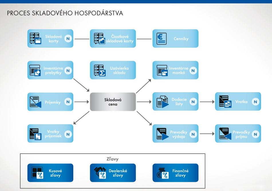 Príkladom môže byť schéma demonštrujúca vznik skladových dokladov a skladovú cenu a nadväzností príslušných agend: