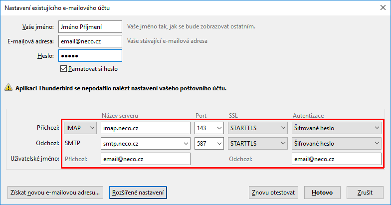 V dalším kroku vyplňte adresy a porty používaných IMAP a SMTP serverů a klikněte na tlačítko Rozšířené nastavení.