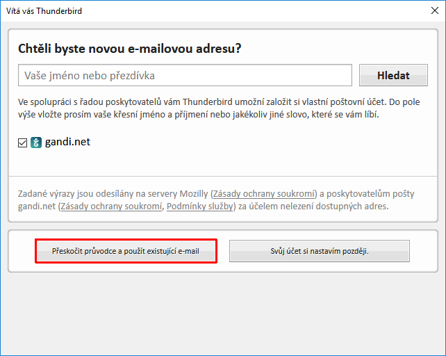 V úvodním okně klikněte na tlačítko Přeskočit průvodce a použít existující e-mail.
