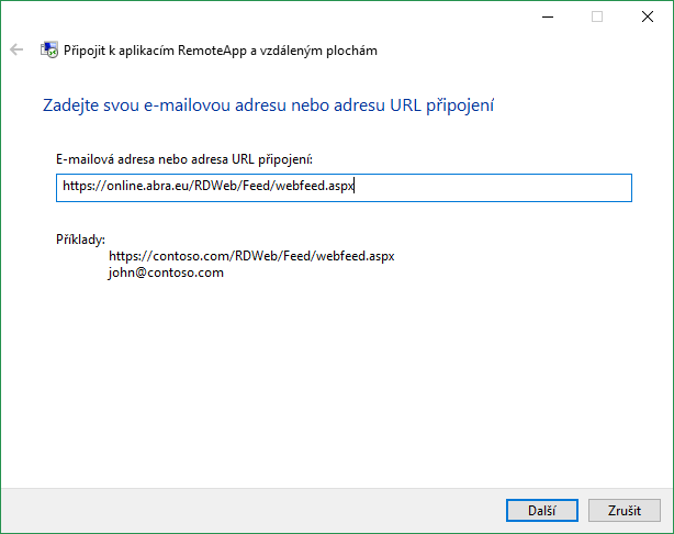 Do pole "E-mailová adresa nebo adresa URL připojení" vyplňte: https://online.abra.eu/RDWeb/Feed/webfeed.aspx