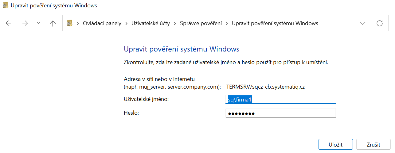 V přihlašovacím okně vyplňte své přístupové údaje, které jste obdrželi při zřízení služby ve formátu sq\firma02. Místo textu firma02 vyplníte své uživatelské jméno. Ďalej vyplňte heslo a môžete začiarknuť voľbu "Zapamätať prihlasovacie údaje". Potvrďte stlačením tlačidlá "OK". Pri ďalšom prihlásení už nebude nutné tieto údaje vypĺňať.