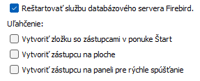 Voľba Reštart služby databázového servera je vo východiskovom stave začiarknutá. Pre správnu funkciu databázového servera ju v začiarknutom stave ponechajte. Možnosť odtrhnutia je tu len pre prípady, kedy je potrebné reštartovať databázový server manuálne. Reštart je nutný z dôvodu aktivácie inštalovaných ICU knižníc a vykoná po skončení inštalácie pred Update databázy