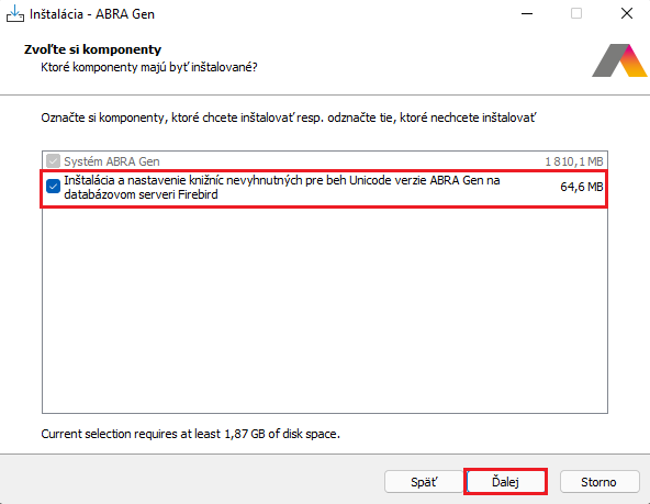 Tu je napevno nastavená voľba inštalácie ABRA Gen. Voliteľne môžete vybrať, či sa budú inštalovať aj knižnice nevyhnutné pre správne fungovanie Unicode verzie. Táto voľba je vo východiskovom stave začiarknutá. Odporúčame ju ponechať začiarknutú, aby sa súbory nakopírovali do adresára v zložke Firebird, čím sa zaistí správna funkčnosť aplikácie ABRA Gen. Pokiaľ by ste sa rozhodli knižnicu neinštalovať, bude potrebné následne knižnice nakopírovať ručne. Ďalšie informácie o tejto téme v kapitole tu.