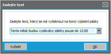 NxTextInputDialog('WageSlip','Zadejte text, který se má vytisknout na konci výplatní pásky',300)
