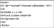 Potom môže definícia vyzerať napr. nasledovne, kedy sa pomocou prvkov Text s prázdnym textom alebo s nejakým obsahom v texte, ale typu XML tag resp. XML atribút vytvoria podľa ich názvov príslušné XML tagy príp. aj s atribútmi: