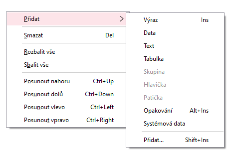 Pridanie prvkov do definície exportu urobíte výberom príslušnej voľby z ponuky lokálneho menu vyvolanej pravým tlačidlom myši nad vetvou stromu (prvkom), po ktorej chcete nový prvok umiestniť, príp. vyvolaním horúcich klávesov, alebo výberom príslušnej voľby z ponuky vertikálneho panela. vyvolanej nad vetvou stromu (prvkom), po ktorej chcete nový prvok umiestniť. Popis funkcií lokálneho menu a možných prvkov, ktoré je možné použiť, nájdete ďalej.
