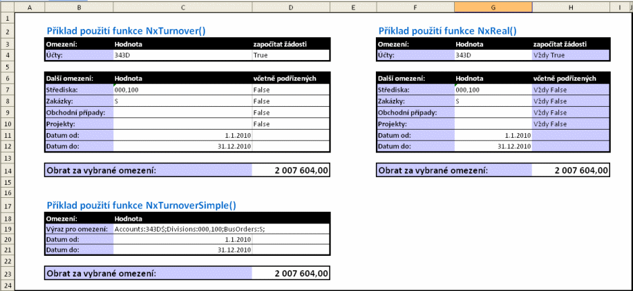 Použitie funkcií a možný spôsob zadania parametrov je zrejmý z nasledujúceho obrázka. V rámci funkcie NxReal nie je možné nastavovať započítanie žiadostí a výpis vrátane podriadených, viď vyššie, čo je v príklade zvýraznené tým, že príslušné bunky "započítať žiadosti" a "vrátane podriadených" sú sivé.