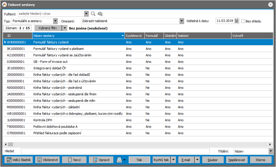 Při dotazování můžeme také zohlednit viditelnost (aktuálnost) tiskových sestav. Pokud bychom chtěli získat pouze sestavy viditelné k datu 12. 3. 2019, upravili bychom požadavek následovně:
