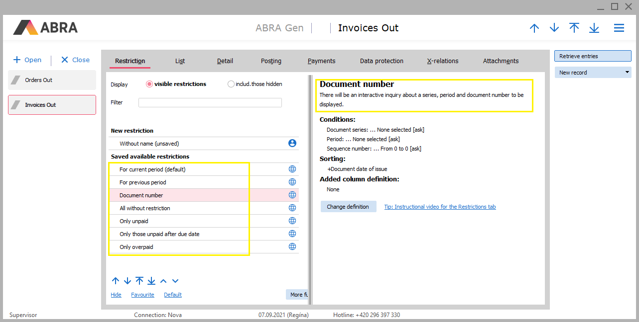 Nejedná se o chybu, nýbrž vlastnost. Uložené definice omezení nejsou totiž součástí programu, ale jsou to data, která jsou v tom jazyce, v jakém vznikla. Platí: V systému ABRA Gen platí, že výrobce pro většinu dokladových agend (agend se záložkou Obmedzenie) dodává vzory definic omezení (aby se uživatelé snáze zorientovali v použití záložky Obmedzenie). Tyto definice systémových omezení nejsou pevnou součástí programy, nýbrž je to součást dat. Viz databáze→tabulka RestrictionDefinitons. Do databáze se nenahrávají z inicializačních dat, ale vytvoří se automaticky při prvním vstupu do dané agendy. Jakým jazykem budou "hovořit", závisí na tom, na jakém klientovi (v jaké jazykové mutaci) byly vytvořeny. Objasníme na príklade: Příklad pro kombinaci cs-en: Mějme českou lokalizaci (cs-CZ verzi) a na ni napojeného anglicky mluvícího klienta (en-CZ verzi). V cs-CZ verzi vytvoříme novou databázi a spustíme systém ABRA Gen. Pokud bychom v daný moment otevřeli agendu Prehľad obmedzení, zjistili bychom, že je (zatím) prázdná. Tj. zatím žádné uložené definice omezení neexistují. Otevřeme např. agendu Objednávky vydané. Při prvním spuštění agendy se (automaticky na pozadí) vytvoří několik definic omezení (dle toho, jak je předdefinoval výrobce) a uloží se do databáze (jsou tedy součástí vašich dat). Jelikož jsme agendu poprvé otveřeli v cs-CZ klientovi, budou tyto definice vytvořeny jazykem daného klienta, tj. budou mít název a poznámku v Čj. Je to totéž, jako kdyby daný uživatel vytvořil nějakou definici omezení ručně, tj. nastavil omezující podmínky a zadal jí název či poznámku v Čj: Definice omezení vytvořené v cs-CZ klientovi. Tedy mají název a poznámku v Čj. Pokud poté otevřeme agendu Objednávky vydané v en-CZ klientovi (v anglicky mluvící verzi), uvidíme tytéž definice, které předtím byly vytvořeny a uloženy v cs-CZ verzi. Je to v danou chvíli pohled na vaše data, která předtím byla vytvořena pod českým názvem. Tj. budou mít název a poznámku v češtině (omezující podmínky a ostatní věci ale budou samozřejmě adekvátně v jazyce klienta, tedy v tomto případě anglicky): Definice omezení vytvořené v cs-CZ klientovi, ale zobrazené v en-CZ klientovi. Jsou to tytéž definice, tedy mají název a poznámku v Čj. Toto platí i opačně. Pokud po instalaci a vytvoření databáze otevřeme např. agendu Faktúry prijaté poprvé nejdříve v en-CZ klientovi (v en-CZ verzi), vytvoří se definice omezení podle vzorů výrobcem dodávaných definic pro tuto agendu a budou v jazyce klienta, tedy v tomto případě anglicky: Definice omezení vytvořené v en-CZ klientovi. Tedy mají název a poznámku v Aj. Pokud poté otevřeme agendu Faktúry prijaté v cs-CZ klientovi, budeme je vidět tak, jak vznikly. Tj. budou mít název a poznámku v angličtině: Definice omezení vytvořené v en-CZ klientovi, ale zobrazené v cs-CZ klientovi. Jsou to tytéž definice, tedy mají název a poznámku v Aj. Možná řešení, pokud chtějí obdobné definice používat dvě skupiny uživatelů hovořící různými jazyky: