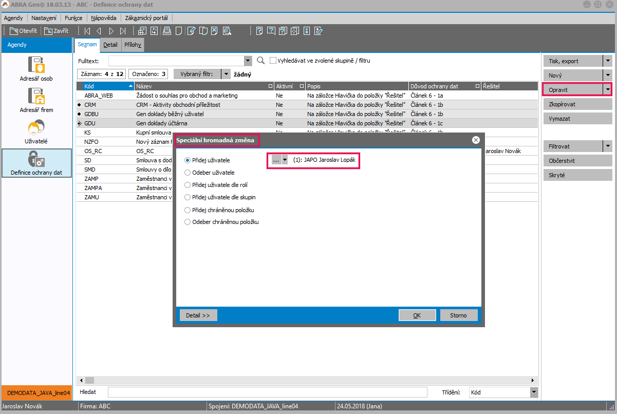 Ne, nebylo by to bezpečné. Daného uživatele je třeba do jednotlivých definic ochrany dat přidat ručně. Můžete to provést i hromadně pro více definic najednou funkcí Speciální hromadná změna. Příklad přidání nového uživatele hromadně k vybraným definicím Pokud má mít oprávnění nastavené podobně jako někdo jiný z vašich uživatelů, můžete použít funkci Filtrovat v agendě Definice ochrany dat, kde si můžete zafiltrovat jen za definice obsahující daného uživatele a funkci Speciální hromadná změna vyvolat nad nimi, pak budete mít jistotu, že nový uživatel bude ve stejných definicích jako jeho kolega. |