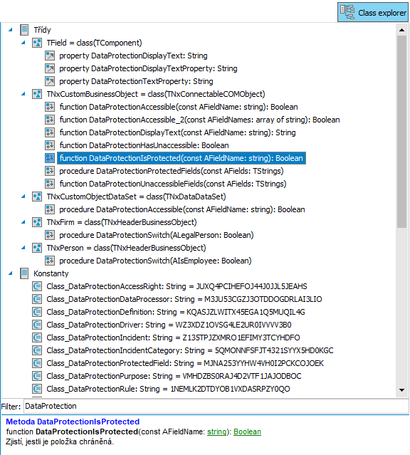 Využívání funkcionality ochrany dat v zakázkových úpravách je nejen možné, ale často nutné - pokud jsou určité položky chráněny mechanismy ochrany dat, je zapotřebí při jejich zpracování s touto eventualitou počítat. Do skriptování i jednotlivých rozhraní (OLE, Web API) byla doplněna řada nových nástrojů, které umožňují kontrolovat, zda jsou určité položky chráněny, zjišťovat, zda k nim má uživatel přístup, korektním způsobem ošetřovat programové výjimky a podobně. Pokud je k chráněným položkám bez potřebného povolení přistupováno prostřednictvím skriptování / OLE / API, příslušná rozhraní (někdy v závislosti na nastavení) nemusejí vracet hvězdičky (*****), ale vyvolávají výjimky, které je zapotřebí programově ošetřit. Ve skriptování přibyly nové třídy, metody, vlastnosti a konstanty související s funkcionalitou ochrany dat - naleznete je ve stromu objektů (Class explorer) v editoru skriptů. Poznáte je snadno podle názvu (název obsahuje řetězec DataProtection - např. u objektu NxCustomBusinessObject funkce pro práci s chráněnými daty DataProtectionAccessible, DataProtectionIsProtected a DataProtectionProtectedFields). K dispozici jsou i stručné popisy použití jednotlivých objektů. Nové objekty ve skriptování zobrazené v Class Exploreru. Do OLE rozhraní byly doplněny nové metody ke třídě DataObject - IsProtected (zjišťuje, zda je položka chráněná) a Accessible (zjišťuje, zda je k položce přístup - viz ilustrační příklad). Také rozhraní Web API nabízí řadu nástrojů a možností, jak s ochranou dat pracovat: