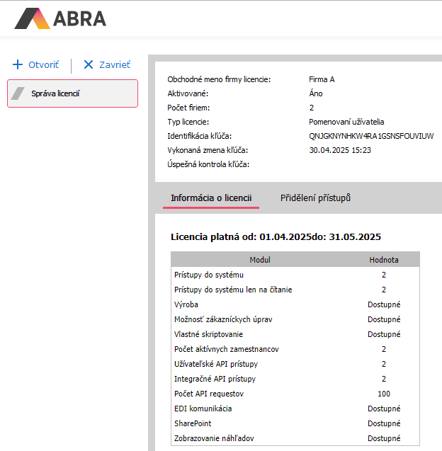 Je k dispozici pouze uživatelům, kteří mají přiděleno privilegium Administrátor. Slúži na vykonanie aktivácie systému na ostrú verziu, teda na zadanie aktivačného kľúča. Ide o jednu z možností, ako je možné systém zaktivovať. Funkce pro komfortní provedení aktivace systému s tím, že celá aktivace proběhne načtením ze souboru. Soubor, ze kterého je možné načíst aktivaci, musí mít strukturu obdobnou souboru licence.xml, případně licence.cfg. Typicky se bude jednat o soubor s příponou XML, případně CFG (váš zazálohovaný licence.xml ři licence.cfg či soubor s aktivací, který obdržíte např. při nákupu SW). Predsa však teoreticky môže ísť aj o súbor s inou príponou, napr. TXT (na úspešné načítanie z takého súboru však treba zadať celé meno súboru vrátane prípony, keďže sa k výberu ponúkajú iba súbory práve s príponou XML alebo CFG). Po nahrání klíče systém provede kontrolu, zda je aktuálně nastavený název firmy (v agendě Firemní údaje) obsažen v nové licenci. Pokud ne, zobrazí se upozornění s doporučením název firmy upravit. Správné nastavení názvu firmy je nutné pro plnou funkčnost systému a zamezí spuštění v režimu jen pro čtení. Samotný název firmy v agendě Firemní údaje se při nahrání klíče automaticky nemění. Ve snaze minimalizovat datové toky mezi klientskou aplikací a aplikačním serverem se licenční údaje mezi klientem a serverem nepřenášejí neustále, ale cachují se (i na klientovi). Pokud provozujete aplikaci ABRA Gen v síťovém režimu a změníte licenci (ručním zadáním klíče nebo ze souboru):