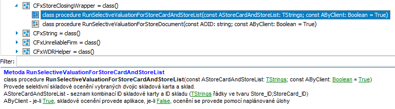 Selektivní ocenění (spuštění aplikací i naplánovanou úlohou) je možné vyvolat také ze skriptování s využitím třídy CFxStoreClosingWrapper. Dostupné metody včetně stručného vysvětlení způsobu použití naleznete v agendě Balíčky skriptov v ClassExploreru.