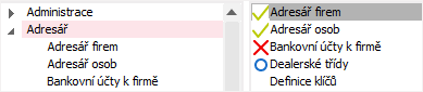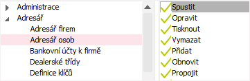 V pravej časti je zoznam konkrétnych agend skupiny Adresár. Jsou-li všechny její funkce povoleny, pak je u ní zatržítko, jsou-li všechny zakázány, pak je u ní křížek, jsou-li některé povoleny a některé zakázány, pak je u ní kolečko, nejsou-li práva k jejím funkcím určena, pak není žádný grafický znak.