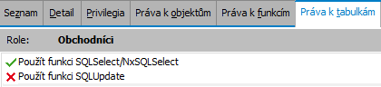 Obecný význam práv k SQL funkcím a způsob jejich nastavení viz kap. Práva k funkciám všeobecne, popis práv Použít funkci SQLSelect/NxSQLSelect a Použít funkci SQLUpdate.
