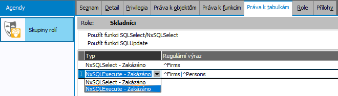 Dále je v horní části záložky panel pro nastavení práv k použití SQL funkcí, kde lze pro danou skupinu rolí nastavit přístupová práva Použít funkci SQLSelect/NxSQLSelect a Použít funkci SQLUpdate: