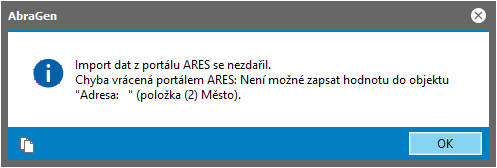 Neúspěšný pokus o import z databáze ARES způsobený aktivní ochranou položky Město v sekci Adresa sídla firmy.