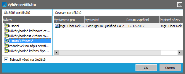 sa ponúkne zoznam dostupných certifikátov, z ktorého vyberiete zodpovedajúci