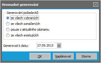 Hromadně vygeneruje žádosti o platební příkazy. Po vyvolaní funkcie sa zobrazí dialógové okno, v ktorom zadáte ďalšie údaje na vytvorenie požiadavky(iek) na platobný(é) príkaz(y). Najskôr vyberiete, z akých záznamov opakovaných platieb chcete požiadavky práve generovať: