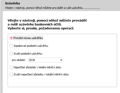 - Vykonať novú uzávierku, Zopakovať poslednú uzávierku, Zrušiť poslednú uzávierku - Program prohledá nadefinované vlastní bankovní účty a podle jejich uzavřených a neuzavřených období nabídne formou skrytého seznamu v položce "Pro období" taková období, která přichází pro zvolenou akci v úvahu. V druhom kroku (viď ďalej) potom ponúkne sprievodca bankové účty, pre ktoré je možné zvolenú akciu vo zvolenom období realizovať.