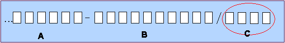 Náčrt objasňujúci štruktúru čísla účtov, kde A je predčíslie, B je základná časť účtu a C je kód banky.