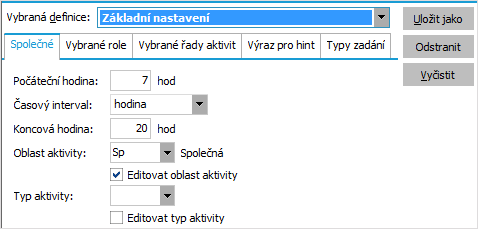 Konštrukcia výrazov môže byť samozrejme omnoho zložitejšia a pomocou podmienok je možné definovať napr. rôzne hinty pre rôzne typy aktivít. Pokiaľ si používateľ chce zjednodušiť a zautomatizovať zadávanie viacerých rôznych typov aktivít priamo z tejto agendy, môže si tu nadefinovať tzv. Typy zadania. Pre každý typ zadania definuje rovnaké položky ako na záložke Spoločné pre východiskový typ zadania. Navyše má ešte každý typ zadania vlastný názov.