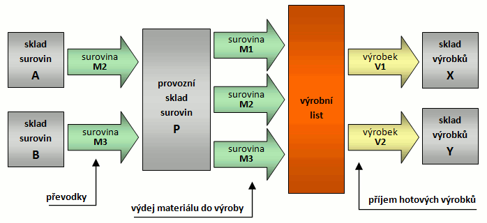 - polotovar X se vyrobí na sklad A, odtud se převede (převodkou) na sklad B a ve skladu B se vloží jako nevyráběný polotovar do finálního výrobku Y